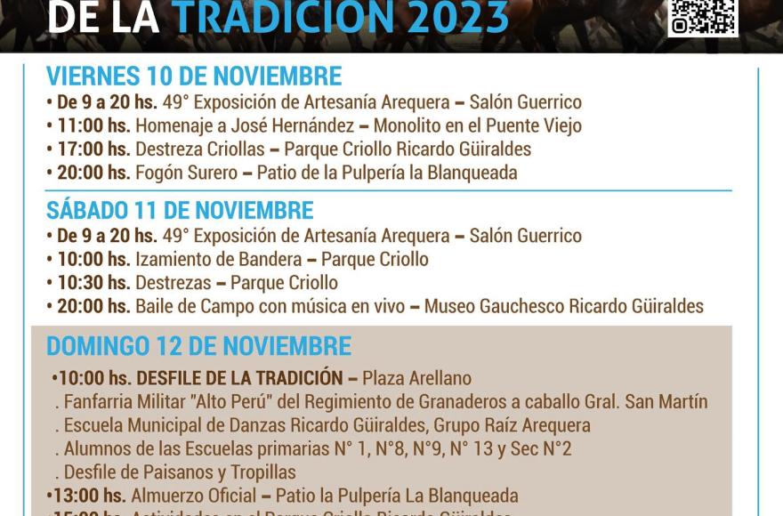 En este 2023, informaron que comenzará este viernes 10 de noviembre y que contará con la 49° exposición de Artesanía Arequera, el Homenaje a José Hernández, la destreza criolla y el fogón surero, para cerrar el primer día.